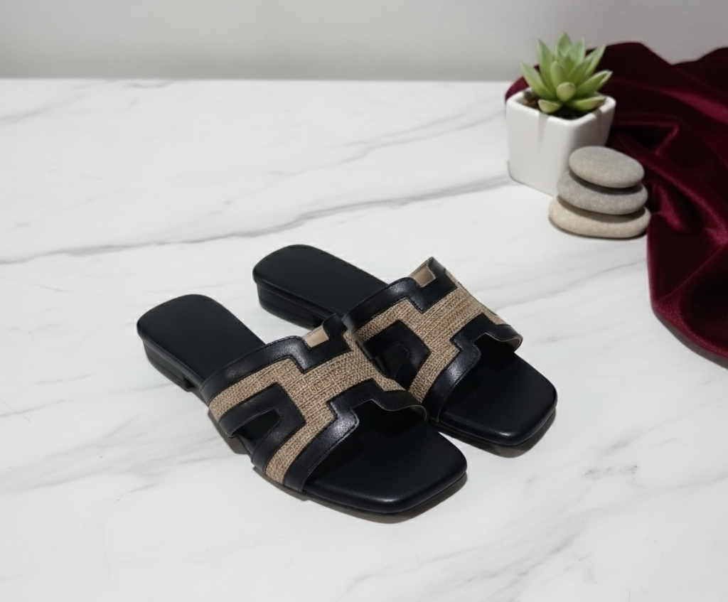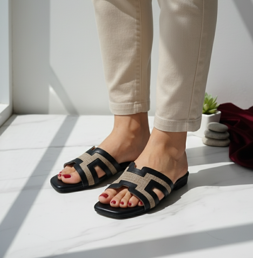 Desain: Flat sandal dengan upper berbentuk huruf “H” – clean dan minimalis