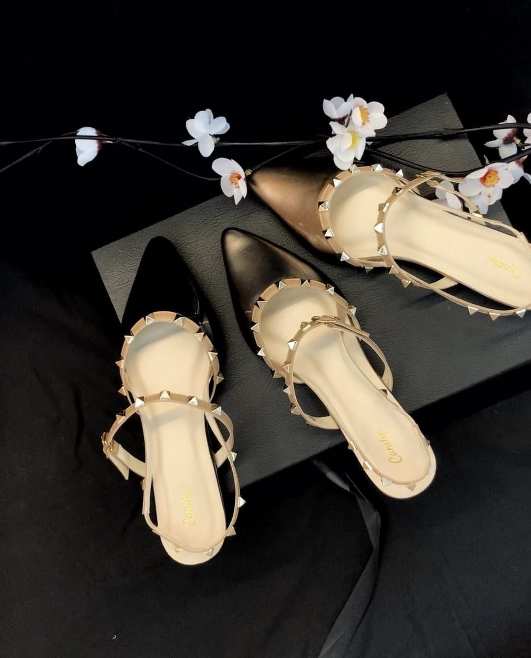 Model: Slip-on mules dengan strap beraksen stud metalik