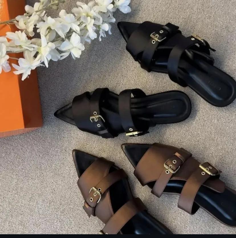 Desain: Mules slip-on dengan aksen gesper di bagian atas