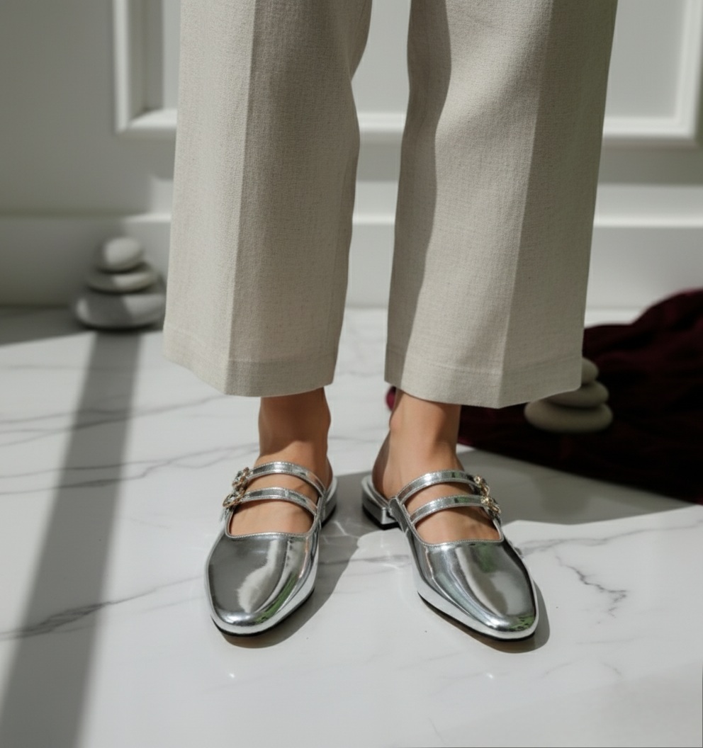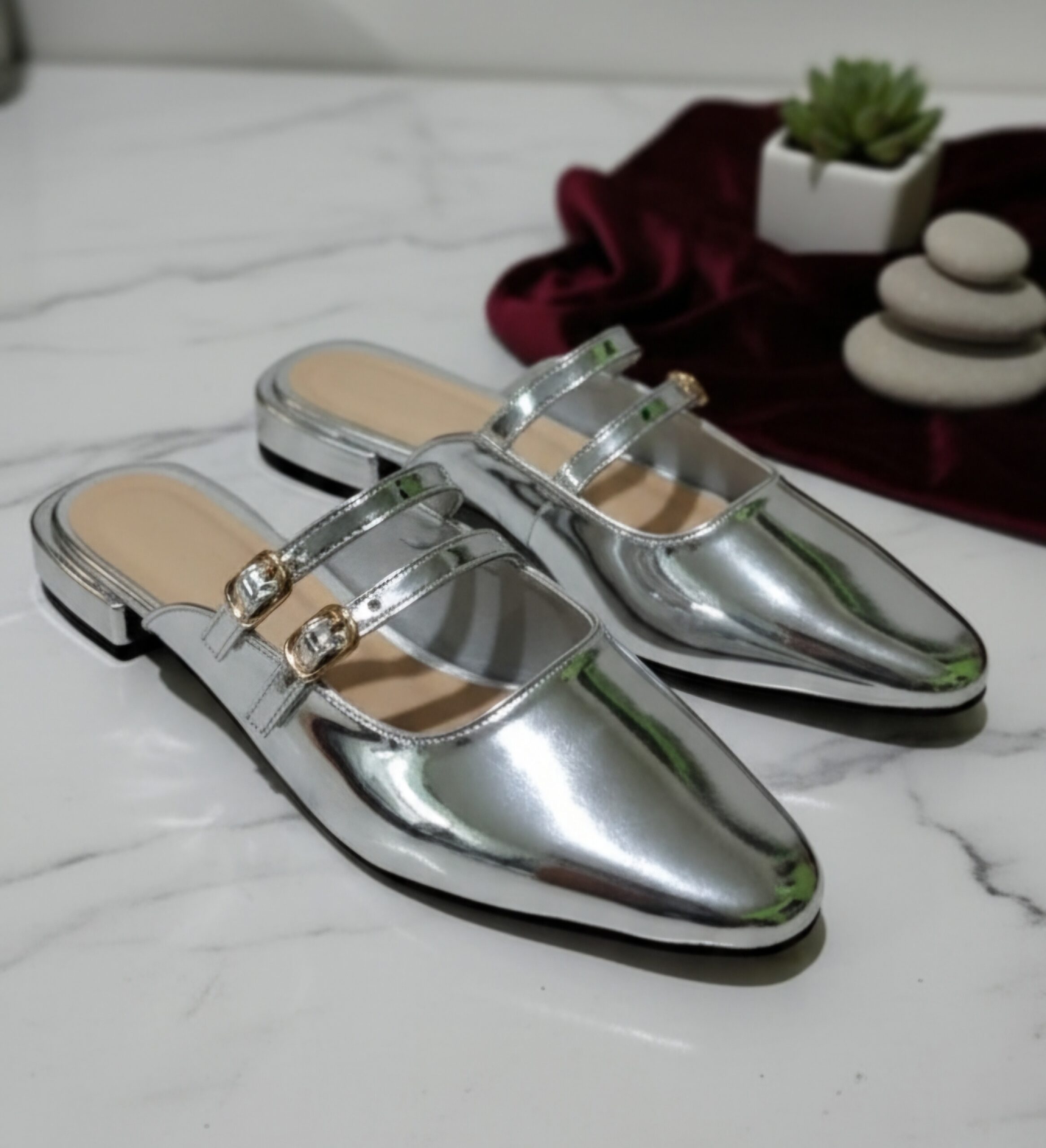 Desain: Bentuk mules dengan 2 buah tali gesper dan hak 3cm.
